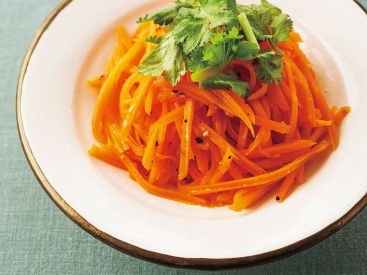 フライパンににんじんを広げ入れ、蒸し汁の材料をふる。ふたをして中火にかけ、4分ほど蒸しゆでにする。ふたを取って余分な水けをとばし、ドレッシングを混ぜたボールに加えて、あえる。器に盛り、好みでパクチーをのせる。