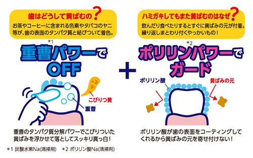 重曹のタンパク質分解パワーでこびりついた黄ばみを浮かせて落とし、ポリリン酸が歯の表面をコーティングする仕組みで、手軽なのに本格的なケアが叶います。