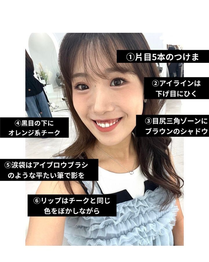 ④黒目の下にリップと同じ色のチークを横長に丸くいれてました!中顔面短縮により、顔が小さく、目が大きく見えます🤍