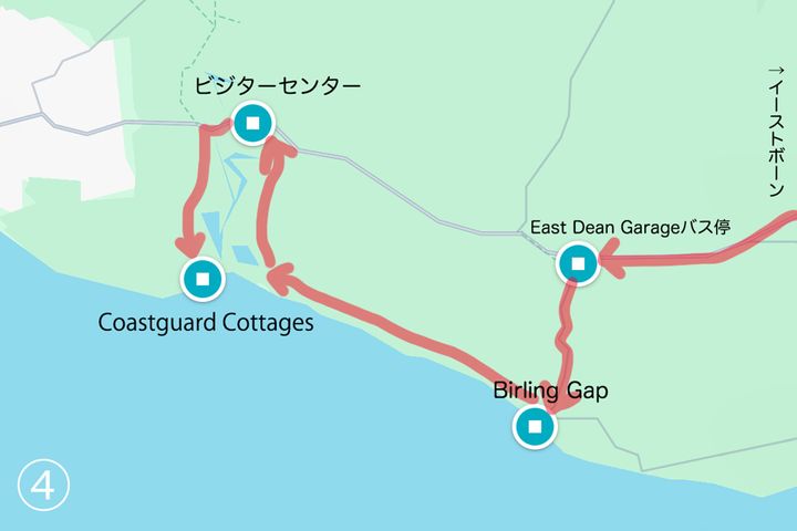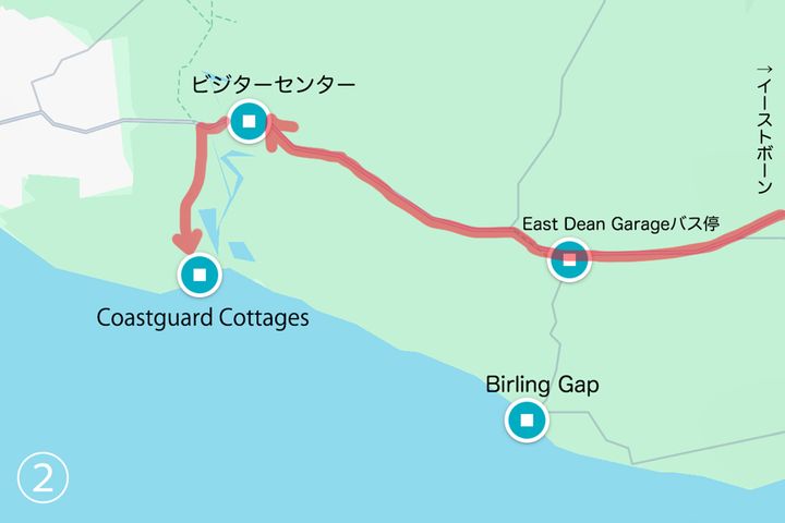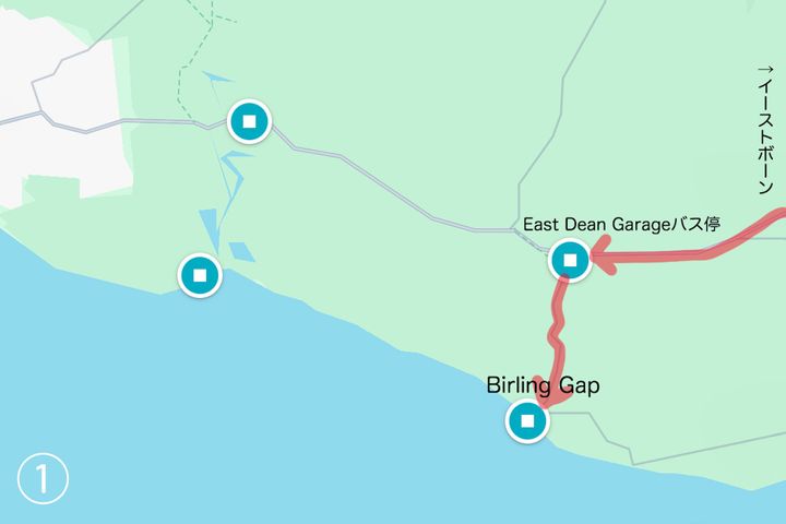 スタート地点は「East Dean Garage」バス停。ここから南にまっすぐ歩いていきます。距離はややありますが、起伏はそこまで無いので初心者でも安心です。