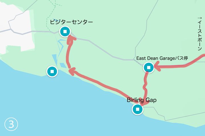 ゴール地点は「Birling Gap」というビューポイント。ここへ直接行くバスもありますし、駐車場があるので車でのアクセスも可能なのですが、「East Dean Garage」バス停からビューポイントへ行くまでの道中が最高に良いので、ぜひその景色も楽しみながら歩いてみて欲しいですね。