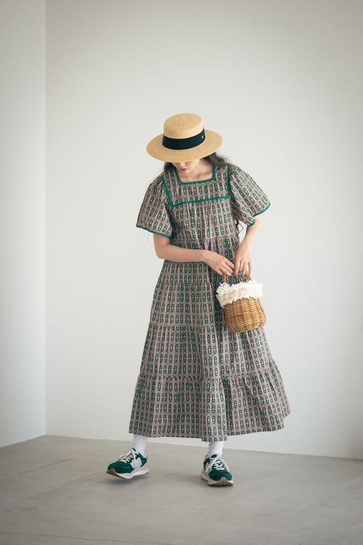 ピンク×グリーンのワンピースを主役に、カンカン帽とカゴバッグを合わせたガーリーなコーディネート。そこに《ニューバランス》のスニーカーをプラスしてカジュアルダウン。ワンピースの柄と色を揃えたグリーンなら、うまくまとまります。足元にスニーカーを持ってきても、カジュアルにならないのは高身長さんのスタイルがあってこそ。