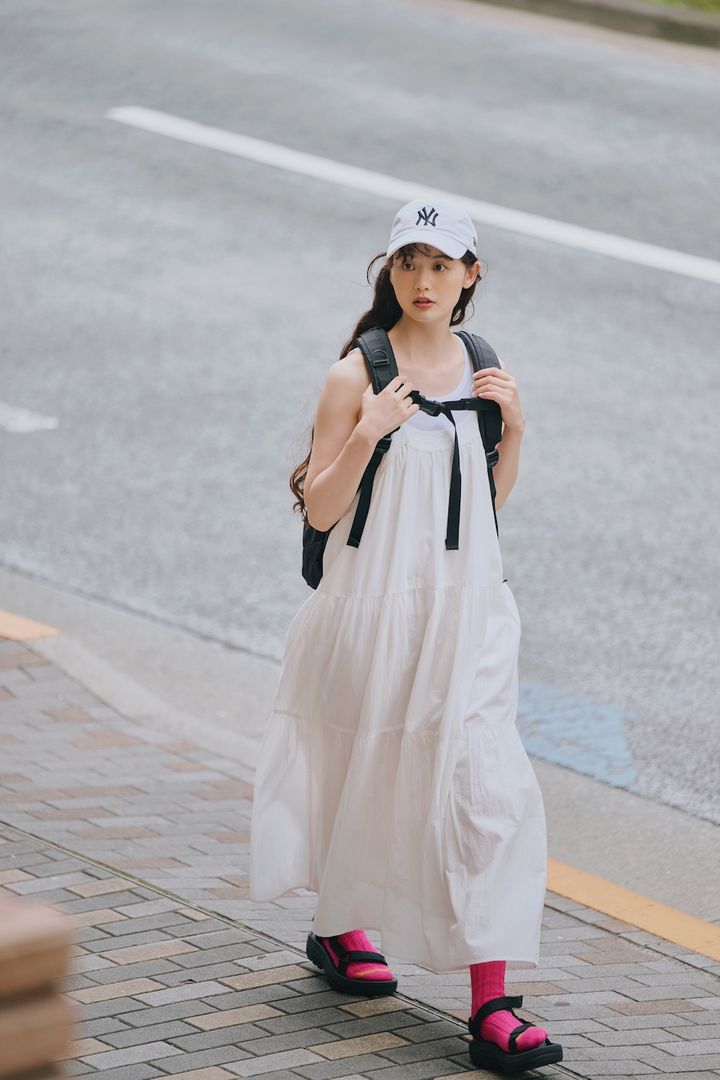 オールホワイトに鮮やかな靴下を差し色にした、夏のお嬢さんスタイル。よく見ると、タンクトップとワンピースはトーンの異なる白をレイヤード。これこそ、同色合わせの楽しさなのです。パンチのあるピンクを足下に投入すれば、ふんわりしたスタイルをきゅっとまとめてくれます。高身長だからこそ着こなせる、ロング丈もお似合いです。