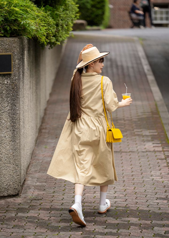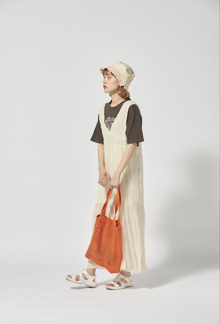 動きやすいけど洒落感も加えたい、そんな“古着屋巡りをする日”がテーマのコーディネート。透け感のあるフェミニンなワンピースを、スポーツサンダルとバケットハットでハズして。フェミニンなアイテムを選んでこそ、高身長ならではのスタイルの良さを生かした大人っぽさが際立ちます。夏らしいオレンジのバッグを差し色に。