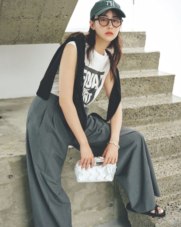 8月24日(土)、去年から引き続き大人気アイテムの「グレーパンツ」は、長期的にオシャレに着こなしたいアイテム。そんな優秀パンツを今期らしく取り入れるなら、大胆なロゴ入りカットソーでカジュアルなムードに着崩して真面目さを刷新するとうまくいきます。無骨な雰囲気にならないよう黒トップスを肩がけするひと工夫で、たちまち洗練された上級者の装いに。休日感のある小物を細部に散りばめれば、好印象に仕上がります。
