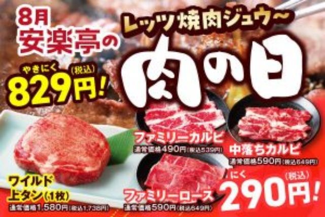 「安楽亭」の肉の日は人気の焼肉「ファミリーカルビ」「ファミリーロース」「中落ちカルビ」が肉の日特価の290円で楽しめます。さらに、ワイルド上タンが829円(税込)でも食べれちゃう♪