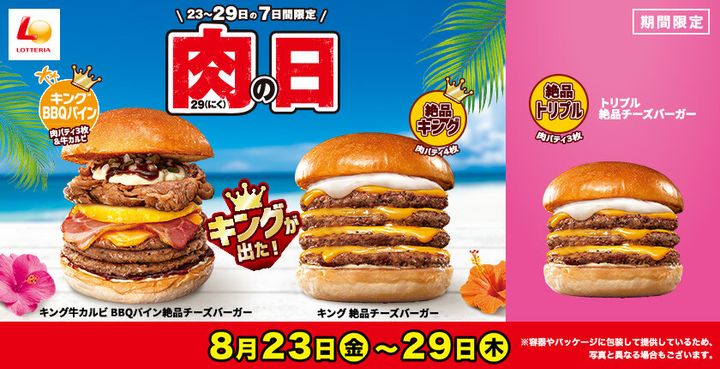 「ロッテリア 肉(29)の日」は、期間限定商品「BBQパイン絶品チーズバーガー」をキングサイズで提供されます。ハワイ料理の定番食材であるパインとフルーティーかつスモーキーなBBQソースを使用した食べ応え抜群の一品。また、人気定番商品「絶品チーズバーガー」の牛肉100%のパティとレッドチェダーチーズを贅沢に4枚重ね、とろ~りチーズソースをトッピングした「キング 絶品チーズバーガー」もありますよ。また、人気定番商品「絶品チーズバーガー」の牛肉100%のパティとレッドチェダーチーズを贅沢に4枚重ね、とろ~りチーズソースをトッピングした「キング 絶品チーズバーガー」も♪