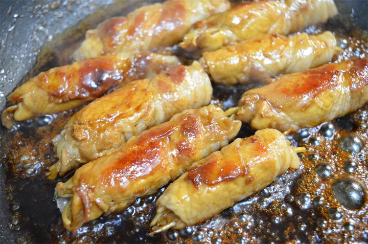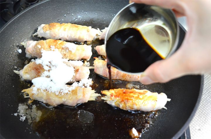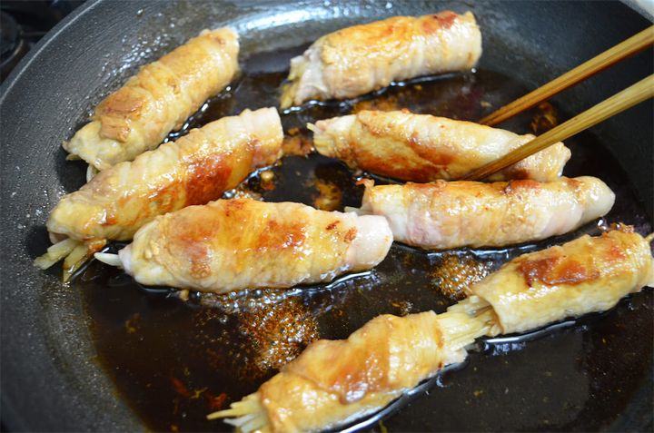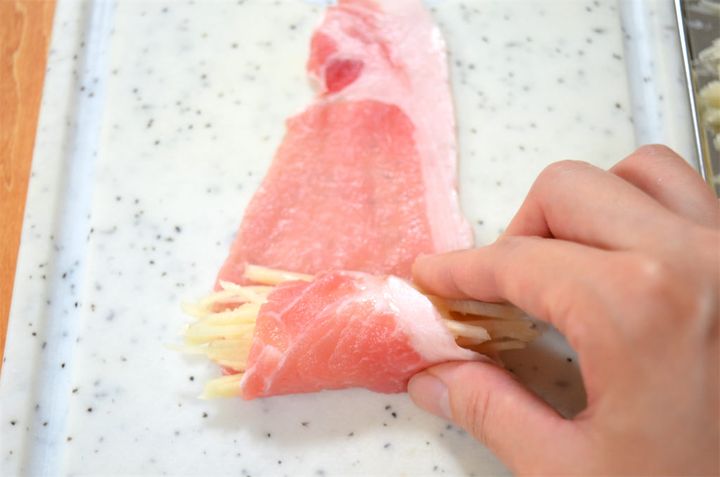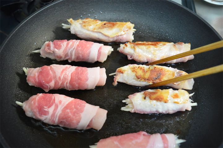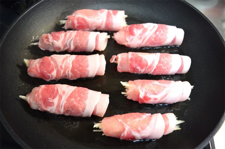 2新しょうがを豚肉で食べやすい太さに巻き、油を熱したフライパンに巻き終わりが下になるように並べる。