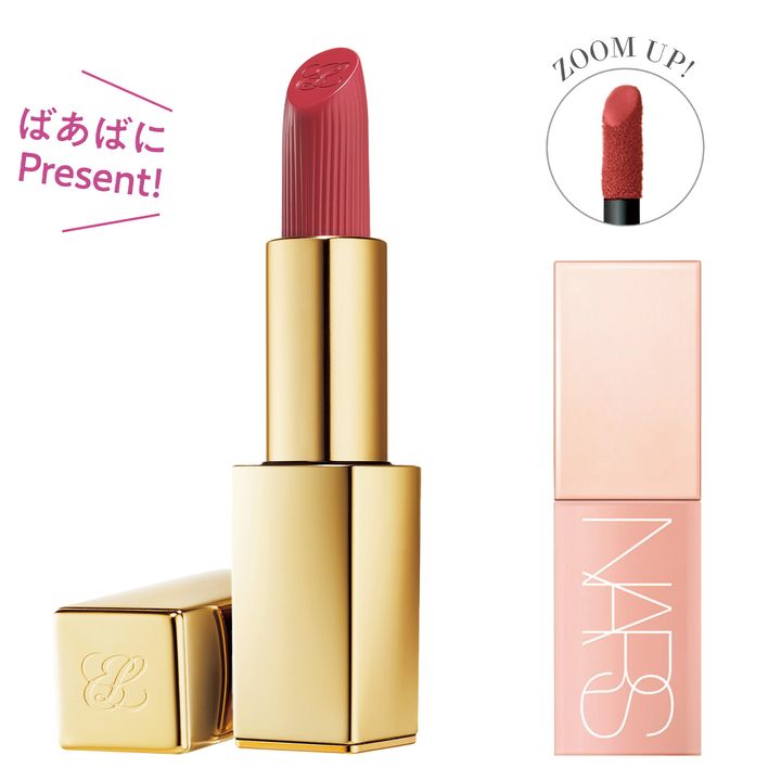 左から:ピュア カラー リップスティック クリーム420 ¥5,280(エスティローダー)NARS アフターグロー リキッド ブラッシュ 02799 ORGASM ¥4,840( NARS JAPAN)