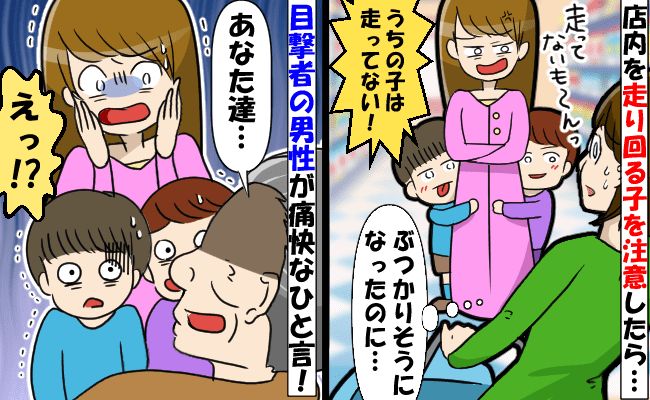 1回目は仕方がないと思い何も言いませんでしたが、2回目は何かあってはいけないと思い「お店の中で走っていたらけがしちゃうよ、気をつけてね」と、できるだけやさしい口調で伝えました。すると、それに気づいた兄弟の母親がやってきて「ほっといてください!」「うちの兄弟はそんなことしませんけど?」と不審者を見るかのような目で見てきます。兄弟も何食わぬ顔で「僕たちは走ってないもん」と言うではありませんか。私は、いやいや走ってたの見てたから! しかも母親も見てたよね……とモヤッとします。