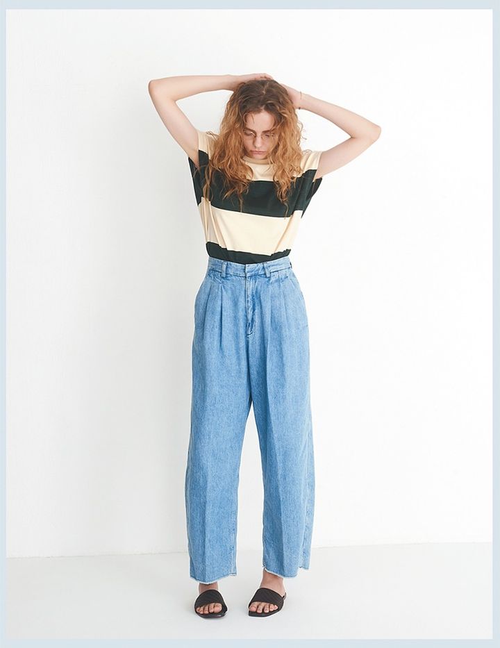 ウエストの周りに程よい余白を生むタック入り。股上深めのハイウエストなら、ヒップラインを拾うことなく美脚もかなう。ウエスト部分の留め具を見せないデザインや、色ムラのないキレイなブルーも端正な見た目に貢献。