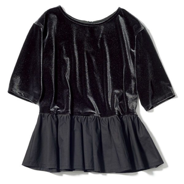 シックなブラックベロアのトップスにペプラムヘムで軽さを加えて。