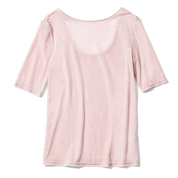 ヌーディなピンクベロアが新鮮。レオタードのようなコンパクトシルエットで女性らしく。