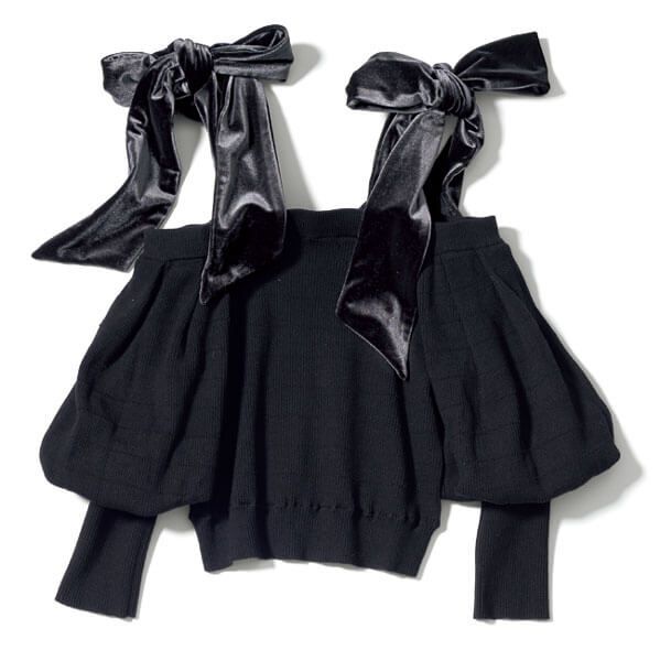 肩の部分のベロアのリボンストラップでオフショルニットをゴージャスに味付け。