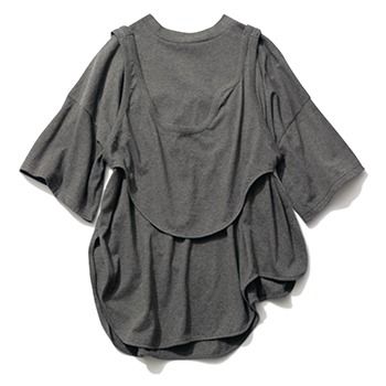 それぞれすそがアシンメトリーになったオーバーサイズのTシャツとショート丈のタンクトップは、別々でも着用可能。 グレーレイヤードTシャツ/någonstans