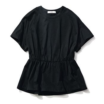 通常のウエスト高めに切り替えをつくったことで、腰の位置も上がって見えてスタイルUP。さらにゆったりとしたそでは腕の華奢見せ、フレアになったすそもウエストまわりを細く見せてくれるという、メリットの多いデザイン。 黒フレアTシャツ/ebure(ebure GINZA SIX 店)