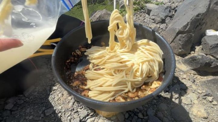 マンガ「山と食欲と私」 (Ⓒ信濃川日出雄/新潮社)に登場するレシピの再現で、アレンジでカルパスを加えてみました。作中では乾麺から作っていますが、水とガスの節約のため、「水漬けパスタ」にしてみることにしました。