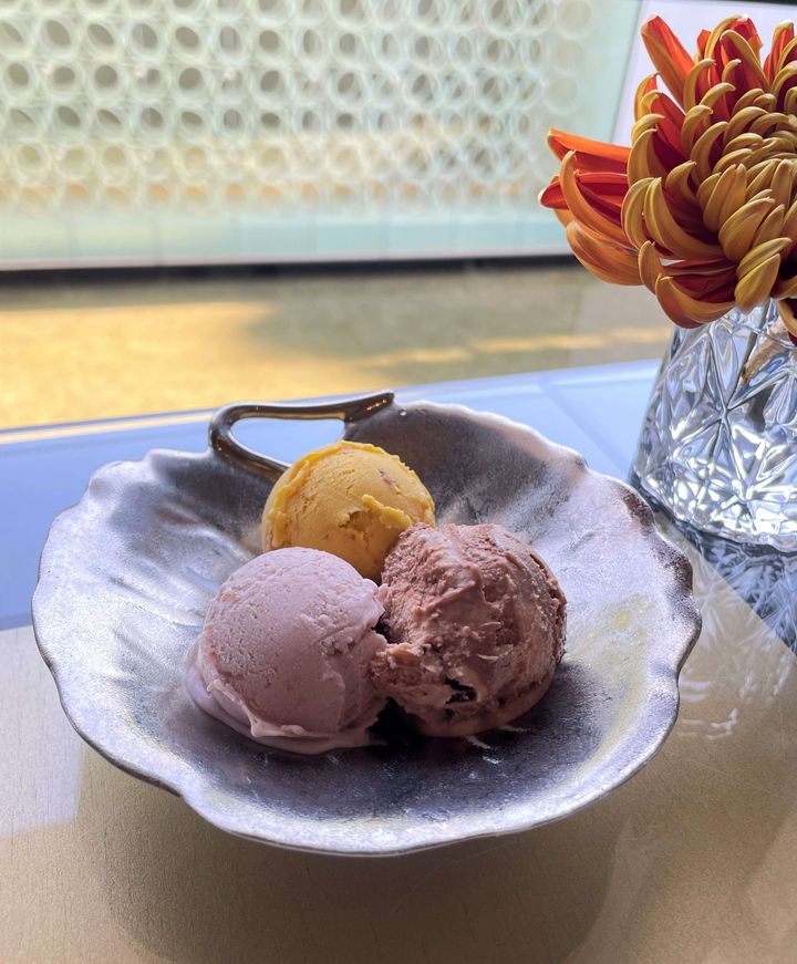 ビュッフェスタイルで楽しめる自家製ジェラートには、「無花果ベリー」「マスカットヨーグルト」「バニラトンカ」など5種類がラインアップ。コンプリートしたい気持ちをぐっとおさえて、さんざん迷って「無花果ベリー」「メープルパンプキン」「ダブルチョコレート」を選択。どれも素材の味をしっかり感じられる、食べたことがないくらい贅沢で濃厚なジェラートでした。とくに、イチジクが最高です。