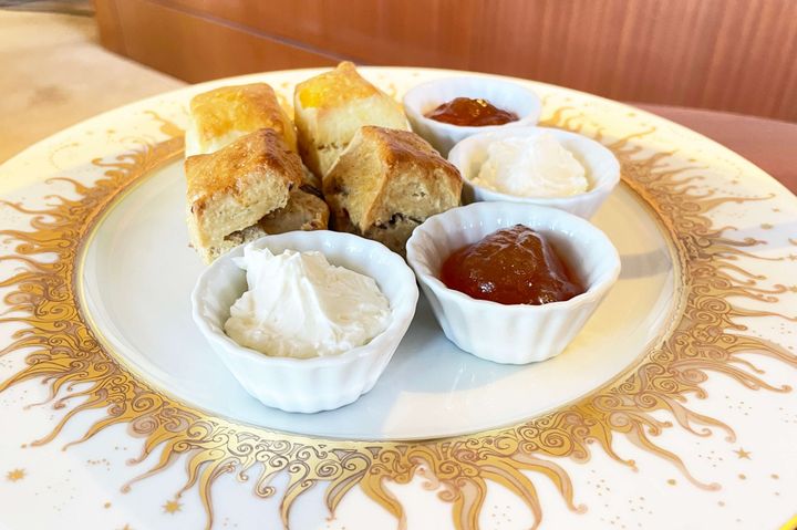 3段目には小ぶりでかわいいプレーンとマロンの2種類のスコーンが。アップルキャラメルジャムとクロテッドクリームが添えられています。