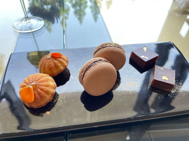 着席すると、出迎えてくれたのはかわいい「プティフルプレート」。マカロンもチョコレートもおいしかったのですが、個人的には左の「マルコナアーモンドのフィナンシェ」が一番好きです。しっとりした生地感もほどよく、形もコロンとしてかわいいですよね! 金粉でエレガントに飾られたこのプレートを目にした瞬間、それまでの汗がスーッとひいて、気分はすっかり秋モードに切り替わりました~。