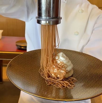 そして、いよいよ今回の主役、グランドデザートの「搾りたてモンブラン フランス産マロンクリーム」をいただきます。ヘーゼルナッツのザクザクした食感のメレンゲをベースに、中心に栗を丸ごと一粒おいて、生クリームで囲った上から、フランス産の濃厚なマロンクリームをたっぷり。ゲストの目の前でマロンクリームを絞り、仕上げに贅沢に金粉をあしらって提供してくれます。食べ進めるごとに違う食感に出合えることと、濃厚なのに甘さをおさえた口どけの良いマロンクリームで、1個あっという間に食べてしまいました!落ち着いた甘さの〝大人のモンブラン〟という感じで、個人的にはかなり好みです。