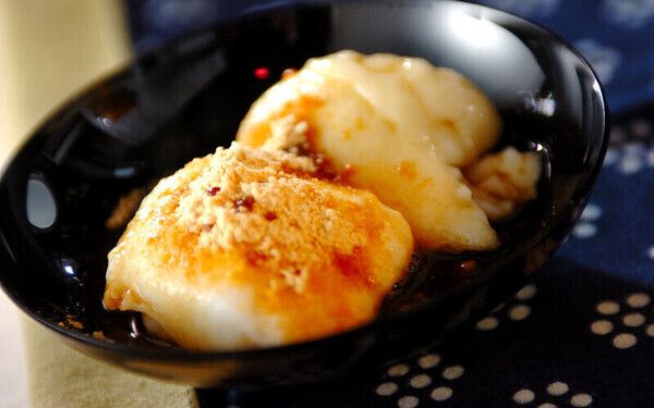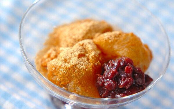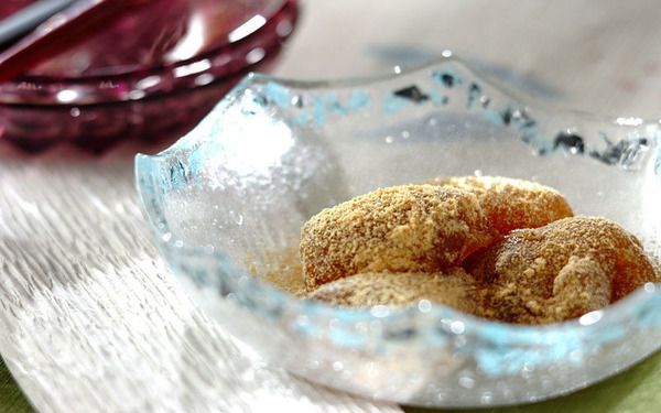 3、合わせたきな粉の半量をまな板に広げ、(2)を取り出し、残り半量のきな粉をかける。少し冷まし、包丁でお好みの大きさに切り分け、器に盛る。