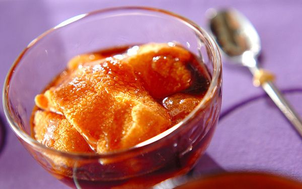 わらび餅自体に甘さを加えずに作るのもおすすめです。鍋で加熱し、冷ましたら黒みつときな粉をかけていただきましょう。黒みつの濃厚な甘さがシンプルなわらび餅によく合いますよ。レシピでは型に流し入れていますが、熱いうちにスプーンですくって冷水に落としてもOKです。