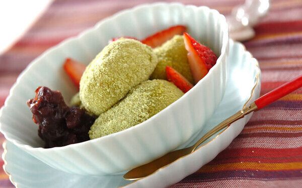 牛乳で作ったわらび餅に抹茶アイスクリームを添えて、和風パフェに。牛乳のコクとアイスクリームの相性は間違いなしの組み合わせです。生のイチゴをトッピングすると、見た目が華やかになります。