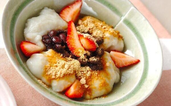 わらびもち粉に水と豆乳を同量加えて、アレンジしましょう。真っ白な見た目と豆乳のまろやかさでひと味違うわらび餅を楽しめますよ。わらび餅の甘さが控えめなので、ゆで小豆やきな粉で甘さを調整してくださいね。