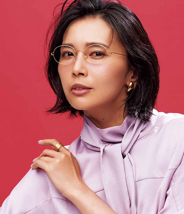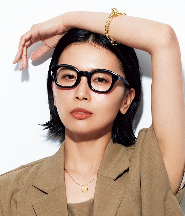 メガネ¥9,900(ゾフ/ゾフ カスタマーサポート)ブラウス¥13,970(SNIDEL)パンツ¥18,700(マイカ&ディール/マイカ&ディール 恵比寿店)バッグ¥18,700(ヴィオラドーロ/ピーチ)フラットシューズ¥15,400(ダイアナ/ダイアナ 銀座本店)ピアス¥101,200バングル¥195,800リング¥125,400(すべてマリハ)