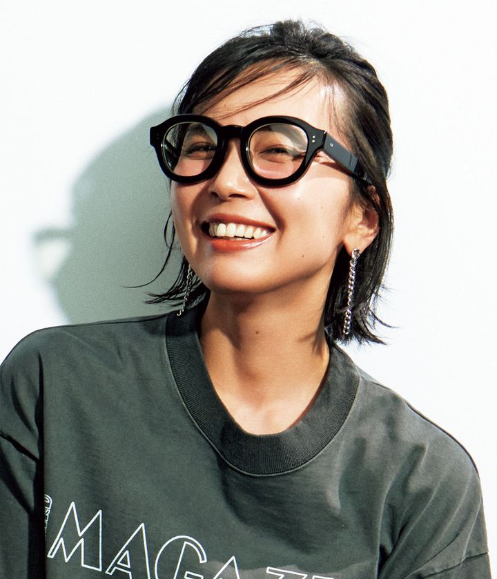 メガネ¥39,600(EFFECTOR/オプティカルテーラー クレイドル青山店)Tシャツ¥14,300(THIRD MAGAZINE)ピアス¥24,200(ウノアエレシルバーコレクション/ウノアエレ ジャパン)