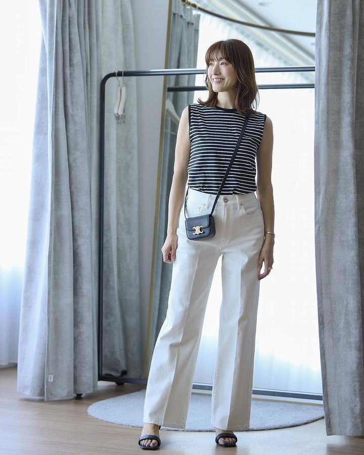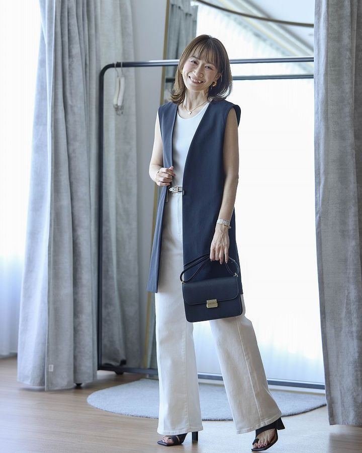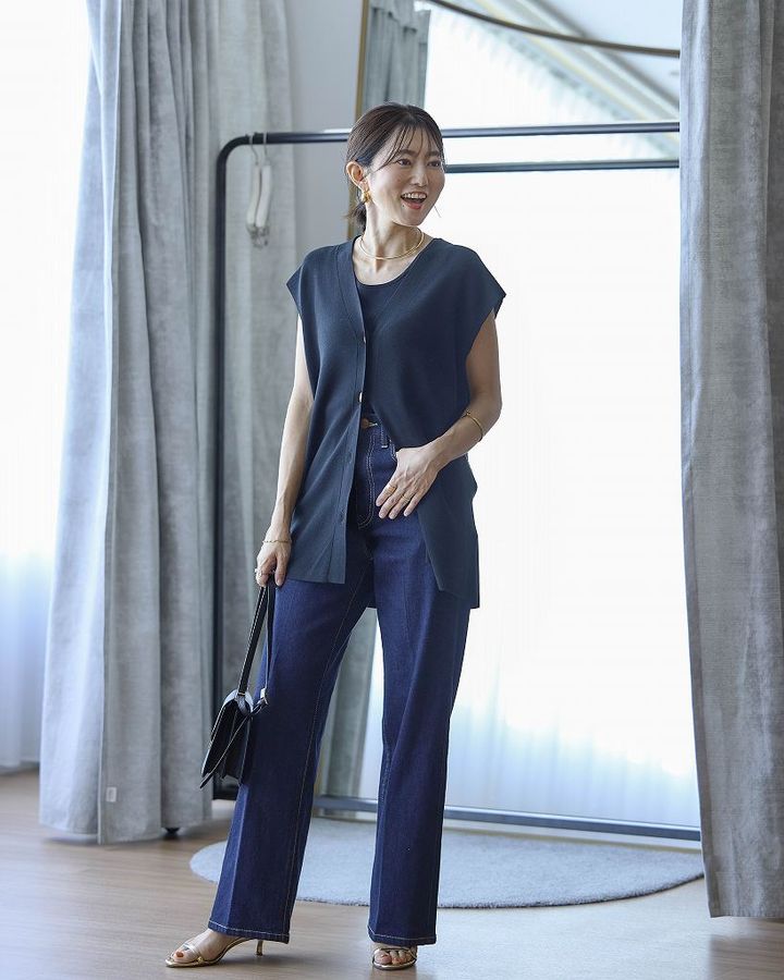 ハイストレッチトリコットノーカラーミドルジレ¥17,000※Mサイズ着用 UVカットレーヨンブレンド2WAYニットタンクトップ¥4,990※Lサイズ着用 PLUS STYLEハイライズワイドジーンズ¥13,000※Mサイズ着用 コンパクトショルダーバッグ¥12,000(すべてプラステ)サンダル(私物)