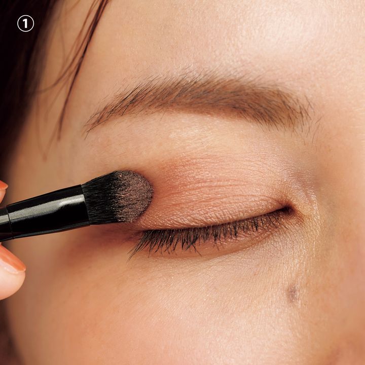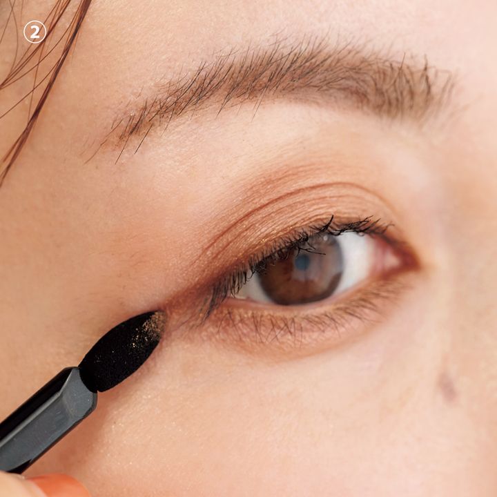 右上を上まぶた全体と下まぶた広めに塗布。グラデ塗りしなくても繊細なパールを含むパウダーが、光の角度で立体的に見せます。