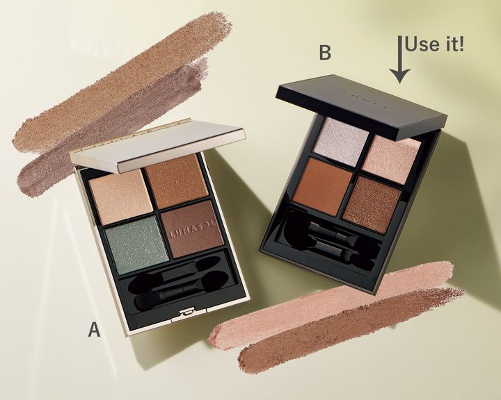 A:淡色で奥行きを作る。ルナソル アイカラーレーションN 03 ¥7,700<8月9日発売>(カネボウ化粧品)B:繊細なパールで立体的に。THREE スターゲージングアイシャドウクアッド 03 ¥7,480<7月31日発売>(THREE)