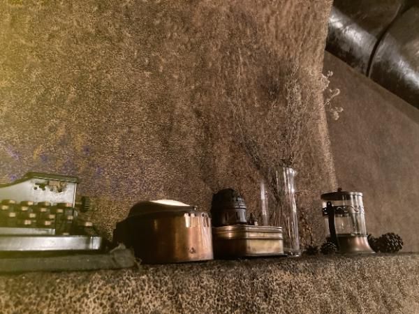 カフェの壁は、凹凸ある洞窟のようなテクスチャー。そこに、アンティークな品が飾られてます。