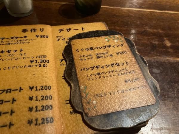メニューを開いて…パッと目を惹かれたのは、『くぐつ草パンプティング』 くぐつ草といえばカレーが有名ですが…こちらのパンプディングも名物と聞きます!!ブレンドコーヒーとセットでお願いしました。
