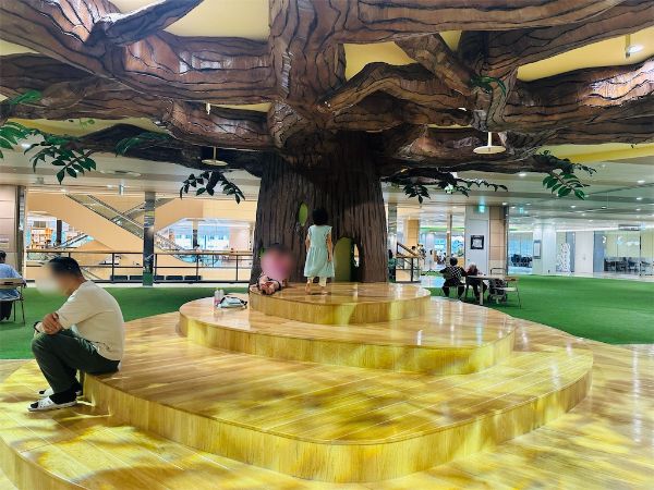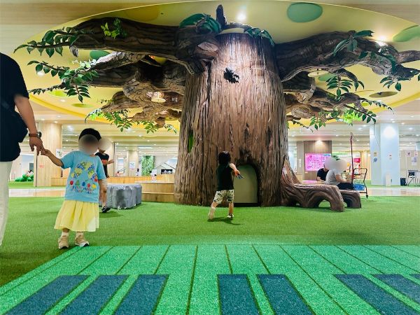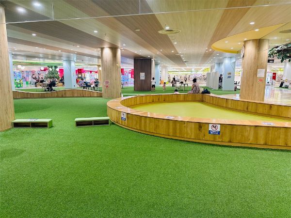 まるで都市公園のような広大な芝生広場が印象的。府中天満屋の2階にあるので、天気を気にせずにおもいっきり遊べます。