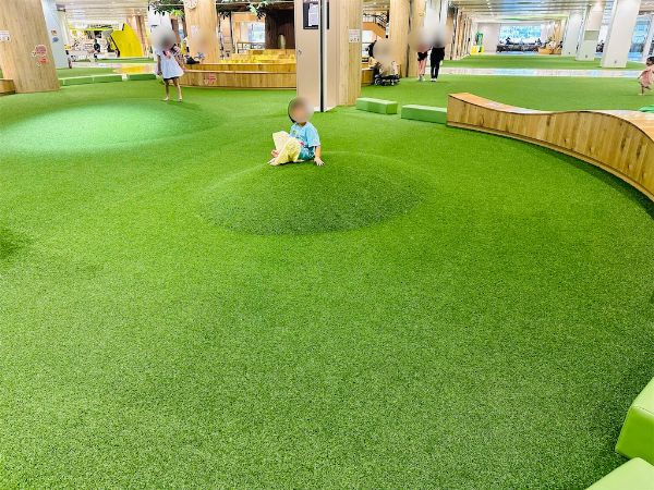 広大な芝生広場の中には土足禁止のエリア「サンサン広場」があり、よちよち歩きの赤ちゃんも遊ばせやすいです。 我が子は盛り上がったところがお気に入り!