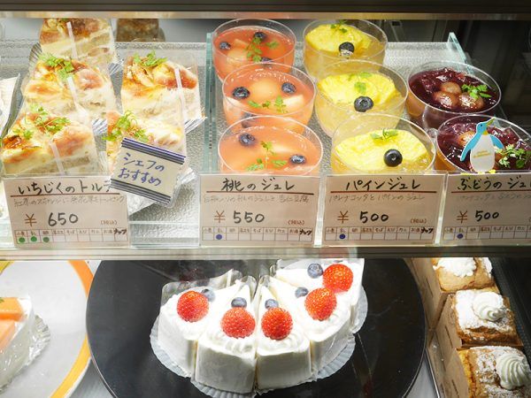 店内のショーケースには、定番のケーキと季節限定のケーキがずらり。 マカロンや生チョコもありますし、300円台のプリンやクラーブ・パフ(オムレットでバニラクリームをサンドしたおやつ)、シフォンケーキなど手土産にも重宝しそうな商品のラインアップも豊富です。