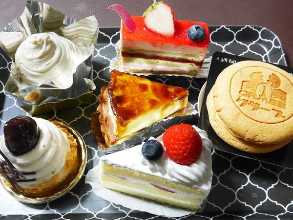 今回は定番人気のケーキと、発売されたばかりの秋のケーキ、そしてバニラクリームをサンドした「クラーブ・パフ」を試食させていただきました。 手前から時計回りに…