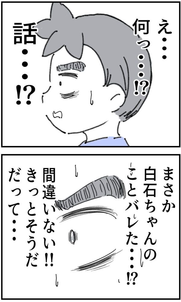 いつもと違うかおりさんの様子にうろたえるいちろうさん。「え・・・何っ!?話・・・!?まさか白石ちゃんのことバレた!?間違いない!!きっとそうだ。だって・・・」白石さんの仕事を引き受けたことがバレたに違いないと感じました。