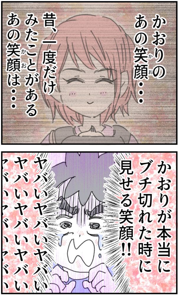 「かおりのあの笑顔・・・昔、一度だけ見たことがある。あの笑顔は・・・かおりが本当にブチ切れた時に見せる笑顔!!ヤバいヤバいヤバいヤバい」かおりさんが本気で怒っていることを察したいちろうさんは大慌てです。
