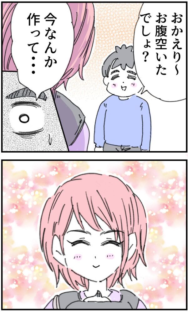 「おかえり~お腹空いたでしょ?今なんか作って・・・」かおりさんに笑顔で声をかけたいちろうさんは、満面の笑みを浮かべるかおりさんを見て固まります。
