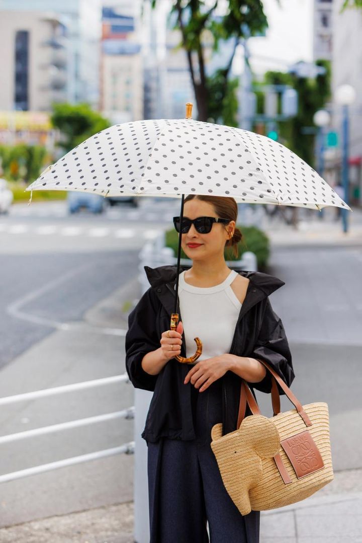 「今年はシンプルなコーデに合わせたくて、ドットの日傘をトラディショナルウェザーウェアで購入しました。見た目よりも軽くてお気に入り。使いやすすぎて、色違いでブラックも持っています」堀あかねさん・153㎝(KONKYU COO/2歳の女の子ママ)