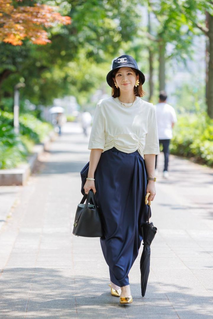 「愛用歴2年のサンバリアはストライプにして大正解。服がシンプルなのでポイントになってくれます。紫外線カット率100%という安心感で信頼し続けているブランドです」福永淑恵さん・160㎝(医師/4歳の女の子と1歳の男の子のママ)