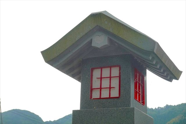 青御影石造りの風流な橋の両端に建つ灯籠をよーく見てみると、石でできたハートが! 実際はハートマークではなく、「猪目(いのめ)」という伝統文様とのことですが、くっきりとしたきれいなハート型です。