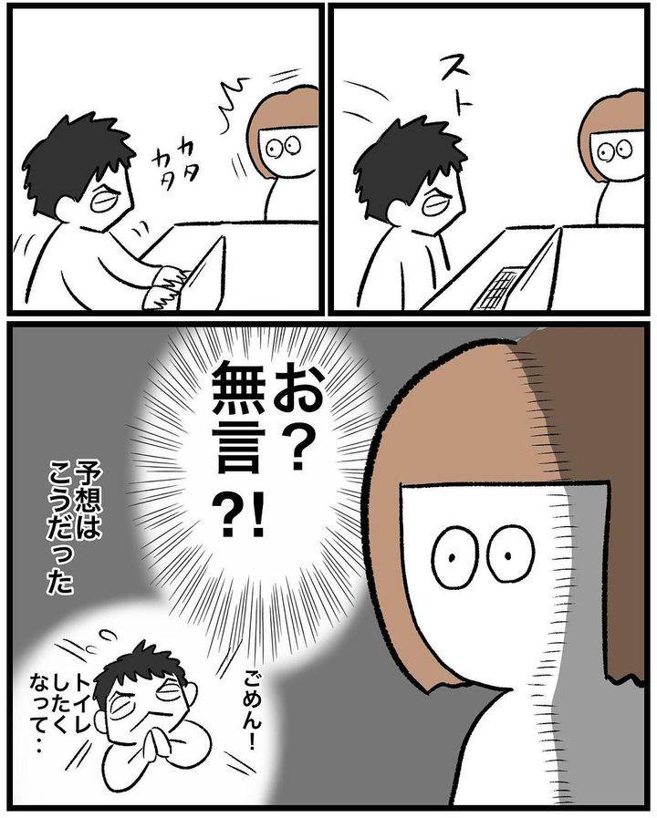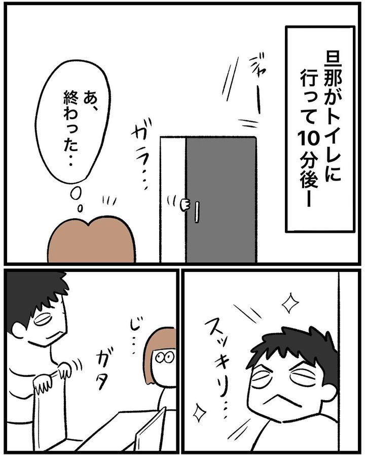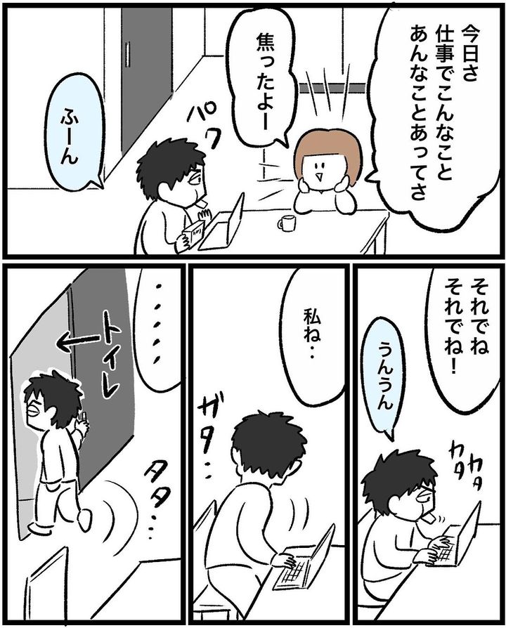 仕事の大変さを夫に話しますが、話の途中で席を立ち、トイレへ。10分後に戻ってきますが、無言で仕事を再開。「私は何の話をしてたでしょーか」と質問する秋山はなさんに対して、「仕事の話…だろ…?」と、大まかな返答をするのでした。