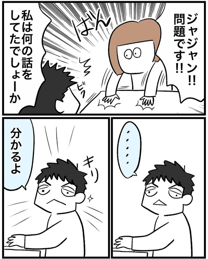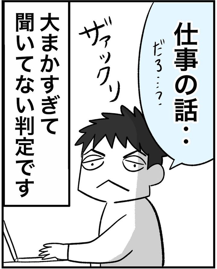 仕事の苦労話は、家族に話してスッキリさせたいものですよね。真剣な表情で、「仕事の話…だろ…?」と返す夫と、「大まかすぎて聞いてない判定です」という秋山はなさんのツッコミおかしく、思わずクスリと笑ってしまいました。
