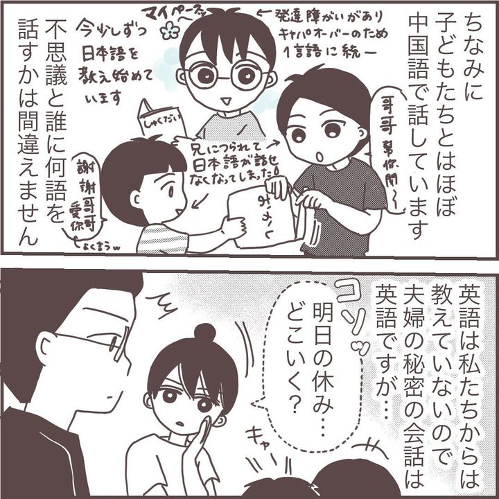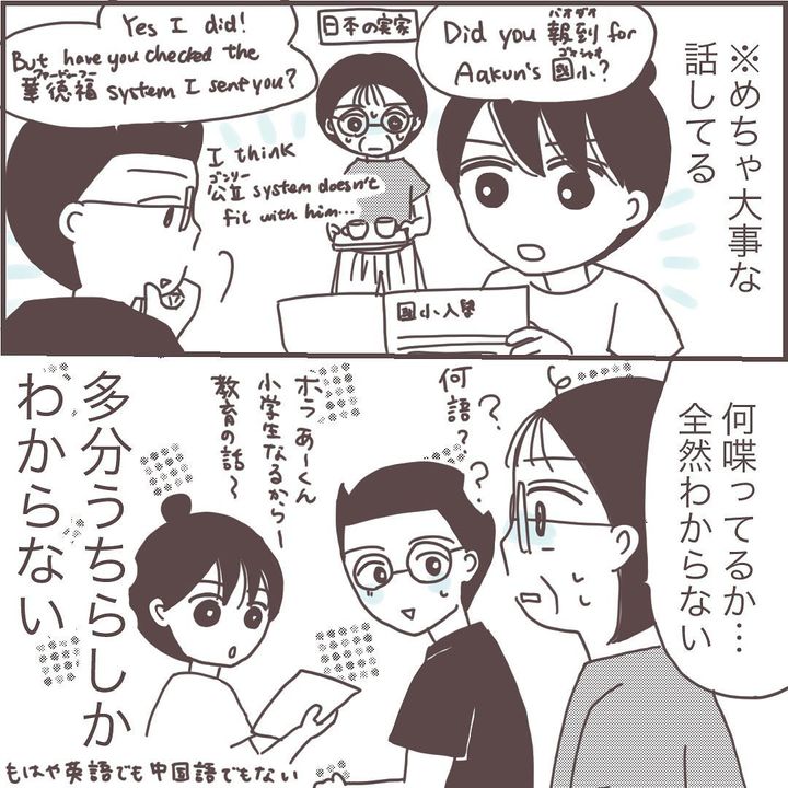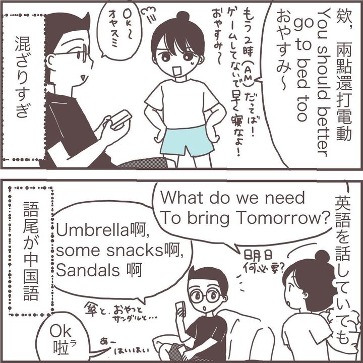 樋口みみさん夫婦の会話には多言語が混ざっているそう。英語、日本語、中国語が複雑に入り交じり、傍から見ると、何を話しているのか理解できないようです。