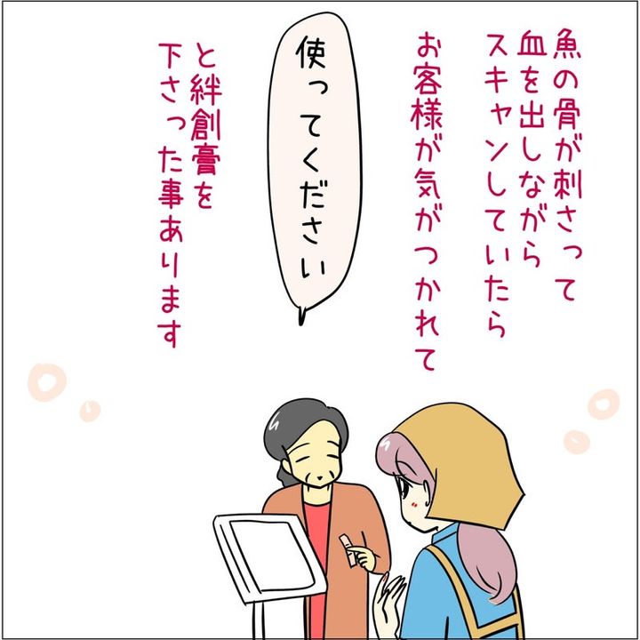 ケガをしているのに気づいて絆創膏をもらえたり、カゴへの商品の詰め方を褒められたり、「おやつに食べなさい」とバナナを分けてくれたりと、さまざまなシーンが描かれていました。